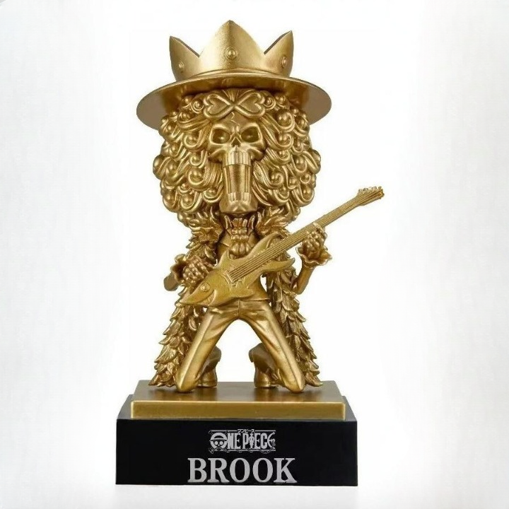 La Figurine Brook One Piece Gold repose sur un socle carré doré et noir, qui crée une base stable et met en valeur l’effet or du personnage.