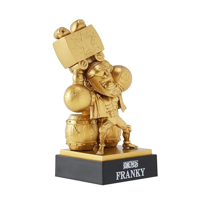 Avec une hauteur de 8 cm, la Figurine Franky Gold trouve facilement sa place dans une petite zone de décoration.