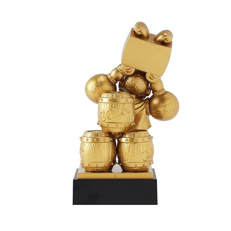 Il se tient debout sur un socle carré doré et noir, une base stable qui met en valeur la posture et l’effet or du personnage.