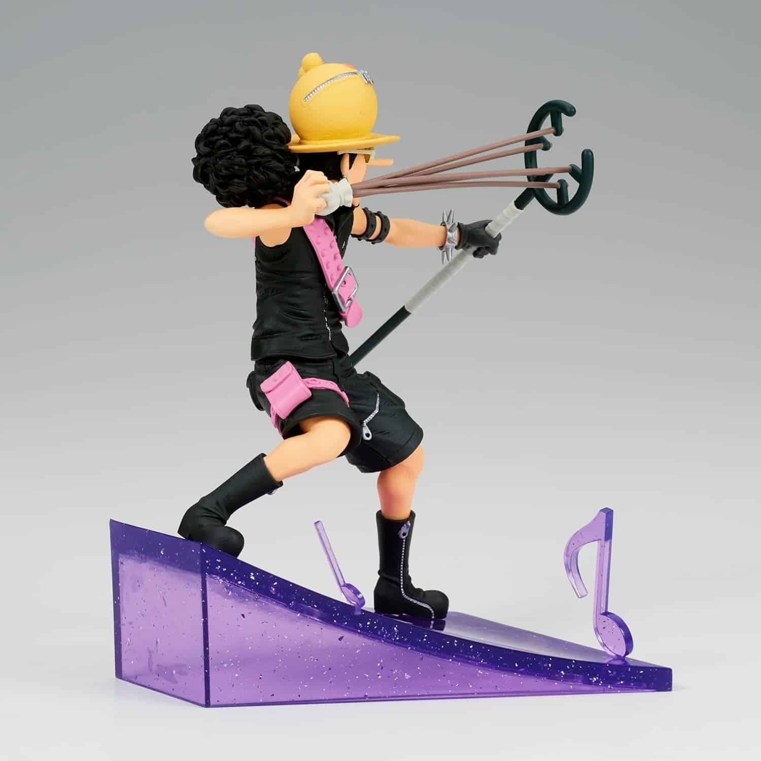 Il est posé sur une pente violette décorée de notes de musique, un clin d’œil direct à l’univers visuel de One Piece Red.
