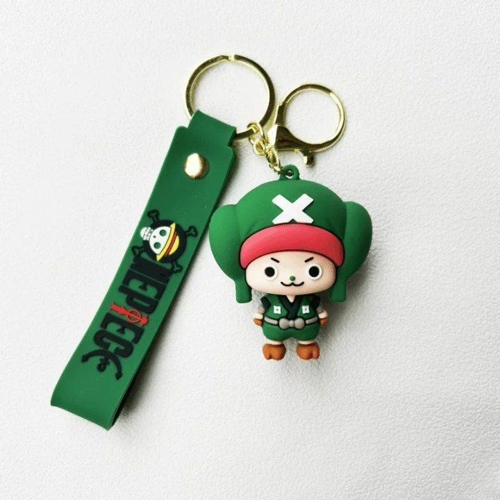 Porte Clé Chopper Vert One Piece avec chainette et anneau doré, facile à accrocher sur des clés, un sac ou une trousse.
