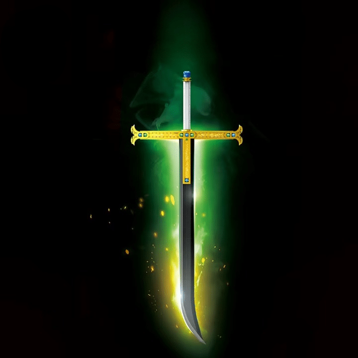 La maquette reprend la forme du long sabre noir en crucifix, un design connu des fans de l’univers One Piece.